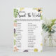 Fresh Off de markt bruiloft tradities spel | Leuk Vrijgezellenfeest Trivia Test uw kennis van huwelijksgewoonten met onze "Fresh Off The Market" Wedding Traditions Game! Dit boeiende en informatieve spel is een perfecte aanvulling op uw boerenmarkt, tuin of vrijgezellenfeest met een rustiek thema. Met onze kenmerkende handgetekende producten en heerlijke waterverf bloemen, vormt het een prachtige aanvulling op uw frisse, natuurlijke esthetiek. Hier is hoe te spelen: Gasten krijgen een spelkaart met vragen over de geschiedenis, betekenis of oorsprong van verschillende huwelijkstradities van over de hele wereld of door de geschiedenis heen. Ze noteren hun antwoorden en dan onthult de gastheer de juiste feiten. Het is een fascinerende manier om leuke trivia te leren over huwelijksgewoonten, sprankelende gesprekken en vriendelijke concurrentie tussen gasten! De "Wedding Traditions"-spelkaart biedt duidelijke vragen en ruimte voor gasten om hun antwoorden in een aantrekkelijk, thematisch ontwerp te schrijven. Het is een gemakkelijke activiteit om te verspreiden aan tafels, het verstrekken van interessante feiten en entertainment. Coördineer dit educatieve spel naadloos met andere items uit ons "Fresh Off The Market"-collectie, zoals uitnodigingen, andere gamekaarten en bewegwijzering, voor een prachtig samenhangend en onderhoudend evenemententhema. Pas de spelkaart eenvoudig aan door de naam van de bruid, de datum van het evenement toe te voegen of de vragen mogelijk aan te passen (afhankelijk van de sjabloon van Zazzle). Verkrijgbaar gedrukt op premium cardstock of als een handige print-at-home digitale download. Klik op "Nu aanpassen" om uw Fresh Off the Market Wedding Traditions Game cards te personaliseren en voeg een vleugje interessante trivia en plezier toe aan uw vrijgezellenfeest! huwelijkstradities spel, vrijgezellenfeest trivia, frisse off-market spel, boeren markt bruids activiteit, rustieke bruiloft spel, tuin thema party spel, printbare tradities spel, bruiloft douanespel, leuke feiten bruiloft spel, bloemendouche spel kaart