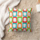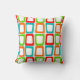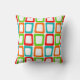 Deze gooiende kussen hebben een modern design uit de midden eeuw van het herhalen van scheefgetrokken rechthoeken in rood, oranje, groen, en turquoise.