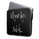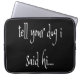 Sla uw laptop onderweg op met een Vertel uw hond dat ik zei dat ik zijn laptophoes heb. Het ontwerp van de laptophoes is voorzien van het gezegde "Vertel uw hond dat ik gedag heb gezegd" tegen een zwarte achtergrond, maar kan worden aangepast aan de keuze van uw kleur. Tekstontwerp is ook beschikbaar op t-shirts voor vrouwen en extra cadeautjes.