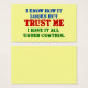 Er staat: "Ik weet hoe het eruit ziet, maar geloof me, ik heb het allemaal onder controle." In veelkleurige letters en een licht gefragmenteerd lettertype dat suggereert dat het alles behalve "alles onder controle" kan zijn.