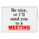 Wees aardig of ik stuur je naar een vergadering, een luiend, grappig gezegde voor assistenten, medewerkers en de baas. Attitude slogan in zwarte en witte letters en rood blok.Meer originele slogans door AngelCityArt
