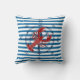 Helder blauw en wit horizontaal patroonvormig ontwerp gooit kussens uit met een nautisch thema met een scheepskompas en kreeft aan beide zijden.