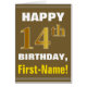 Dit eenvoudige wenskaart met verjaardagsthema heeft een warme verjaardagswens zoals "HAPPY 14th BIRTHDAY, First-Name!" op de voorkant, in vetgedrukte tekst op een bruine achtergrond. Het verjaardagsnummer heeft een faux/imitatie goud-achtige kleurlook. De naam op de voorkant kan worden aangepast. De binnenkant bevat een verjaardagsbericht dat kan worden gepersonaliseerd. Een wenskaart als dit zou een leuke manier kunnen zijn om verjaardagswensen over te brengen aan iemand die zijn veertiende verjaardag viert. [~Z0000281]
