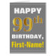 Dit eenvoudige verjaardagsvriendelijke ontwerp van het wenskaart biedt een warm verjaardagswens zoals "HAPPY 99th BIRTHDAY, First-Name!" aan de voorzijde, in vetgedrukte tekst op een grijze (grijze) gekleurde achtergrond. Het verjaardagsnummer heeft een namaak-goudachtige kleur. De naam op de voorzijde kan worden aangepast. De binnenkant kenmerkt een klantgericht verjaardagsbericht. Een wenskaart als dit zou een leuke manier kunnen zijn om verjaardagswensen uit te brengen aan iemand die zijn negenenjarige verjaardag viert. [~Z0000283]