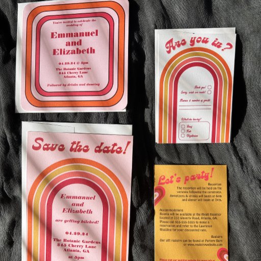 Kondig uw speciale dag in stijl aan met onze Bold Retro Pastel Pink, Hot Pink & Oranje bruiloft Save the Date-kaarten. Deze kaarten zijn ideaal voor koppels die een unieke, grillige en casual receptie plannen en zijn voorzien van een levendige mix van fel sinaasappel, pastelroze en heet roze, waardoor de essentie van de jaren 70-stijl met een moderne twist wordt vastgelegd. Het opvallende ontwerp omvat heldere kleuren en regenboogelementen, waardoor een levendige en vreugdevolle uitnodiging ontstaat die uw liefde en opwinding weerspiegelt. De eenvoudige maar gedurfde esthetiek combineert pastelroze en hot pink met een vleugje geel, waardoor deze Save the Date-kaarten echt opvallen. Ideaal voor degenen die retro charme en felle kleurenpaletten waarderen, deze Save the Date-kaarten zijn een prachtige manier om het nieuws van uw aanstaande bruiloft te delen. Laat het vrolijke en grillige ontwerp de toon zetten voor uw onvergetelijke feest. Maak een blijvende indruk met onze Bold Retro Pastel Pink, Hot Pink & Oranje Wedding Save the Date kaarten, ideaal om uw gasten uit te nodigen voor een leuke, kleurrijke en casual receptie. Vier je liefde met een scheut van 70s-geïnspireerde helderheid en charme.
