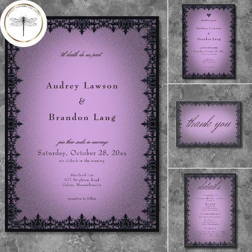 Victorian Gothic Iron Border Purple Wedding Informatiekaartje