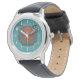 Het horloge van een kind met een cartoon van een roestrode octopus met een gemiddelde fronsachtige, krullende tentakels in alle richtingen en vlezige gekleurde zuigers zichtbaar. Een school vis stroomt langs op de achtergrond. Voor liefhebbers van octopussen en koppotigen met attitude. Voeg uw eigen legenda toe met een eenvoudige wijziging in de bewerkbare tekst die rond het afbeelding loopt. Pas uw horloge aan om de oceaangroene achtergrondkleur te veranderen die omringt en shows door de semi-transparante achtergrondvorm.