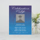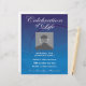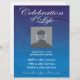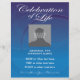 Custom Photo Memorial Celebration of Life nodigt flyer uit op een prachtige blauwe achtergrond met zwopende cirkels. Volledig aanpasbaar met datum, tijd, plaats, enz. Vervang "douanefoto hier"sjabloon met uw eigen foto van de persoon die wordt geëerd. Een viering van het leven is een prachtige manier om herinneringen te delen en hulde te brengen aan een familielid of vriend, naast of in plaats van een traditionele begrafenisdienst.