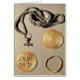 Viking juwelen TtoB LtoR: zilverring en zilverketting met een hanger in de vorm van Thors hamer; goudbroche; verdraaide goudring; goudbroed gelegen in de Hamburger Kunsthalle, Hamburg, Duitsland.