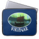 Een enigszins gestileerd afbeelding van een Viking-beugschip dat 's nachts onder de Noordelijke Lichten daar een paar ijsbergen vaart; de meeste bemanning slaapt. Er wordt ook tekst met de tekst "VIKINGAR" (Vikingen) weergegeven.