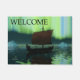 Een enigszins gestileerd afbeelding van een Viking-beukenschip dat 's nachts onder de noordelijke lampjes vaart, samen met tekstlezen: "WELCOME." Er zijn een paar ijsbergen; de meeste bemanning slaapt.