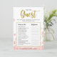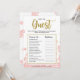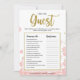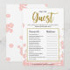 Dit moderne bloemige "Vind de Gast" bruidsfeest spel heeft een roze bloemige achtergrond met gouden glitter spetters. De tekst is geschreven in een mix van een speelse kalligrafie lettertype en een modern sans lettertype, deze Vind de Gast kaart is gepersonaliseerd met de naam van de aanstaande bruid en de datum van het bruidsfeest.