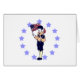 De Amerikaanse kunst op 4 juli met een patriottische jongen die rode vakantievuurwerk vasthoudt en een koloniale Amerikaanse vlag, omringd door 13 blauwe sterren.
