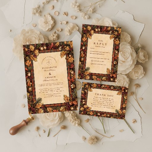 An elegant woodland design featuring golden oak leaves, acorns, and evergreens on a parchment backdrop. The vintage botanical frame and warm earthy palette bring the feeling of fall forests and rustic romance — perfect for autumn weddings or cozy countryside celebrations.