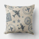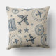 A classic seamless travel pattern throw pillow featuring detailed vintage airplanes, passport stamps, stars, and navigation symbols in deep navy blue on a textured parchment background. The retro aviation aesthetic evokes wanderlust, adventure, and old-world travel charm. Ideal for frequent travelers, aviation enthusiasts, and vintage design lovers. A thoughtful gift for pilots, travel lovers, and explorers—perfect for birthdays, retirement celebrations, travel milestones, or everyday inspiration.