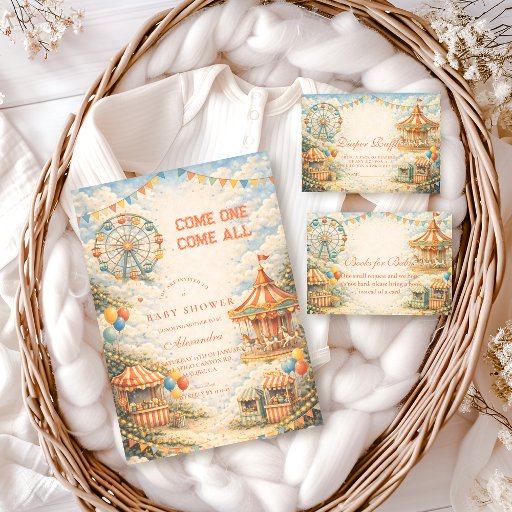 This whimsical circus-inspired design brings a joyful “come one, come all” carnival feel to a baby shower celebration. Featuring a vintage-style big top tent, colorful balloons, festive bunting, and soft cloud details, the artwork feels playful yet polished with a gentle storybook charm. The bright but balanced color palette makes it perfect for a fun, welcoming baby shower that feels cheerful without being overwhelming—ideal for hosts who want something imaginative, lighthearted, and memorable.
