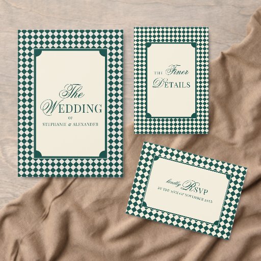 Vintage Emerald Green and Ivory Checkered Old Money Wedding Invitation with Photo – Classic Dark Green & Cream Wedding Template Featuring Couples Photo Overlay