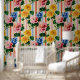 This vintage-inspired floral stripe wallpaper features hand-painted blooms layered over soft vertical stripes for a timeless, boutique look. Bold yellow dahlias, blush pink florals, and rich blue flowers are balanced with lush green leaves, creating a pattern that feels cheerful, artistic, and refined.