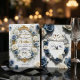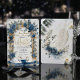 Set the tone for your formal evening union with this sophisticated design featuring romantic swans, deep royal blooms, and elegant vintage typography.This design features a digital illustration of two graceful white swans curving their necks to form a heart shape, set against a backdrop of a faint, ethereal gothic cathedral arch. The swans are nestled in a lush arrangement of deep navy and royal blue roses accented by autumn bronze and brown leaves. The couple's names are displayed in a bold, vintage Blackletter font, while the details appear in a refined script, both simulating a shimmering metallic texture against the dark background.