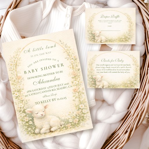 A soft vintage-inspired design featuring a sleeping lamb surrounded by a delicate oval wreath of ivory and blush meadow flowers. The warm parchment background and muted botanical tones create a classic, romantic look that feels calm and timeless. Perfect for a neutral spring celebration or a sweet garden-themed gathering with a gentle storybook touch.