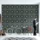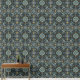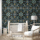 This wallpaper features an intricate vintage Persian medallion pattern in rich shades of blue, gold, and teal on a deep navy background. The ornate, symmetrical design is inspired by traditional Persian rugs, adding a touch of timeless elegance and luxury to any room. Perfect for creating a statement wall or enhancing your home with classic, artistic style.