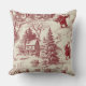 A seamless vintage Christmas toile pattern throw pillow rendered in deep red linework on a cream background, capturing the charm of a winter village scene. The design features Santa Claus carrying gifts, snow-covered cottages, evergreen trees, reindeer, and peaceful snowy paths — all drawn in the elegant, detailed style of classic toile de Jouy. This nostalgic and festive pattern evokes the warmth and tradition of an old-fashioned Christmas.