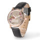 Gepersonaliseerde dames horloge met een bloemenpatroon op een rustieke, geweven look achtergrond.