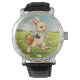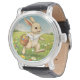Celebrate Easter holiday with this charming super adorable Greeting Card featuring a joyful white bunny hops through a sun-drenched meadow bursting with wildflowers — daisies, tulips, bluebells, and dandelions — while carrying a woven basket filled with colorful, patterned Easter eggs.