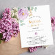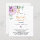 Een witte achtergrond. Versierd met violette, paarse bloemen, rozen bloemen en groene watergekleurde eucalyptus bladeren, takjes, groen en een faux gouden tak. Personaliseer en voeg de naam van de bruid toe om te zijn en feestdetails. Zwarte en goudkleurige letters. 1 vel = 1 uitnodiging afgedrukt rand tot rand.