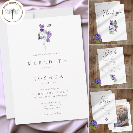 Share your special date with this Violets Watercolor Minimalist Elegant Wedding Invitation, featuring a single sprig of purple violets flowers and classic, clean typography. This minimalist design is perfect for modern or spring or summer weddings, offering elegant style and focusing on simplicity. Fully customizable for a beautiful, understated announcement. Created by Simply Farmhouse Press.