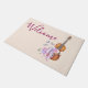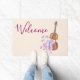 Een welkome deurmat met een zacht vrouwelijk design. Geïllustreerd met een waterverf afbeelding van een houten viool, een aantal roze balletslippers rusten ertegen en versierd met bloemen en vlinders. Zet op een perzik roze gekleurde achtergrond.