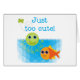 Kleurrijke, knappe T-shirts, bodypakken, mokken, muismatten en nog veel meer met een gouden vis en een groene octopus in een zee blauw en tekst met de tekst "Gewoon te schattig!".