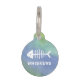 Het ontwerp van deze Pet ID Tag heeft een mooie waterverf gradiënt van blues en greens, met een prominent visgraatsymbool in het wit in het midden, aangevuld door uw dierennaam in bijpassend wit lettertype. Het coole kleurenschema en de speelse beeldspraak maken dit label een schattige keuze voor een huisdier, vooral een kat, gezien de klassieke associatie tussen katten en hun voorliefde voor vis. De zachte mix van kleuren biedt een kalmerend effect, dat zowel stijlvol als functioneel is als een vorm van huisdierenidentificatie.