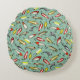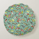 Deze ronde kussen zijn voorzien van illustraties van de visluis die geïnspireerd zijn op vishazen in tinten van rood en geel op een bleke blauwgroen achtergrond.