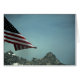 Een foto van de Amerikaanse vlag die in de wind wappert, over bergen.