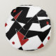 Verschillende witte en rode geometrische vormen zijn verspreid over een zwarte achtergrond, waardoor een schril contrast ontstaat. Sommige vormen zijn verbonden met dunne witte lijnen en rode stippen voegen een pop kleur toe aan de compositie.