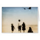 vliegtuig tijdens de vlucht terwijl kinderen op het strand kijken.