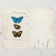 Oude junk journal pagina met blauwe en bruine vlinder wetenschappelijke illustratie op de voorkant en bruine vlinder illustratie op de achterkant. Franse tekeningen en aantekeningen met een Franse bon die achter de eerste vlinder tekening is gestopt. Illustraties van wilde bloemen van lavendel en anijsplanten. Perkamenten pagina's met gouden labels, tape en stikdetails in het midden. Vouw in de helft om journaalpagina's te maken.