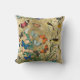 Decoreer uw huis met deze kussen met antiek botanische vlinders, vogels en bloemen in kleuren van sinaasappel, rood, blauw, groen, roze, zwart en bruin, op een elegant gouden kleurig damaspatroon. Ontworpen door © Tim Coffey.