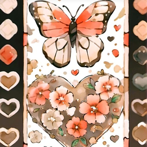 Waterverf illustratie met een vlinder, harten en bloemetjes in een rood en bruin kleurenpalet.