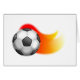 Een kleurrijke illustratie van een voetbal dat door de lucht vliegt met een spoor van hitte of vuur dat in zijn kielzog achterblijft. Afbeelding beschikbaar op diverse giften en producten.