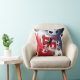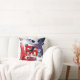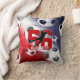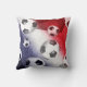 Vrouwen voetballer vierkante gooi kussen met de kleuren van Amerika beschikt over een patroon van voetballen van verschillende maten gecombineerd met een digitale distressed textuur en diagonaal rood wit en blauw kleurenthema - een silhouet vrouw voetballer schoppen een voetbal is voor en midden boven haar jersey nummer (nummer en kleur van het nummer zijn aanpasbaar, momenteel rood) en haar aanpasbare naam overziet haar jersey nummer - door katz_d_zynes