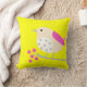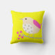 Heldere kleuren op kussen. Roze en witte vogel zijn op een tak met bloesems tegen een felgele achtergrond.