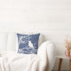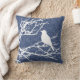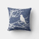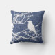 Gooi het kussen in een gestileerd silhouet van een vogeltje dat op een kanten boomtak zit, in het wit, tegen een marineblauwe achtergrond in een Japans wervelpatroon