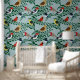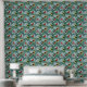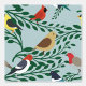 Vele soorten vogels op takken; robins, kardinalen, houten peckers, goudvinken, mus en magneten op een blauwgroen achtergrond.
