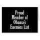 lid van Obama's lijst t-shirts, knoppen, bumperstickers en cadeaus. Het Witte Huis van Obama dringt er bij de aanhangers op aan om mensen te melden die hun mening uiten en daarmee de politieke doelstellingen van de regering tegenspreken. Elke echte conservatief zou trots moeten zijn om op de vijanden van Obama te staan.