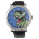 Grappig T-rex met hoofdtelefoon en hoofdtelefoon van virtuele realiteit.