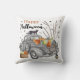Geniet van dit moderne en leuke grijze vrachtwagen Halloween kussen! Waterverf afbeeldingen van een grijs truck met kleurrijke pompoenen in de rug en in een mandje aan de zijkant. Een waakzame zwarte kat loopt langs de bovenkant van de vrachtwagen terwijl vleermuizen door de lucht vliegen. Een bladloze herfstboom en verlichte lantaarn maken het tafereel compleet. Bovenaan in de oranje en zwarte Halloween-typografie staan de woorden Happy Halloween.