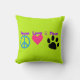 Afbeelding in kleurrijke neonkleuren bevestigen. 3 symbolen - een vredesteken, een hart en een poot, met de woorden vrede, liefde en poten. Voor vredelievende huiseigenaars.