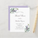 Een stijlvolle witte achtergrond aan de voorzijde. Gedecorbeerd met eucalyptus en lavendel florals. Pas uw namen en gegevens aan en voeg deze toe. Achterzijde: lavender gekleurde achtergrond.